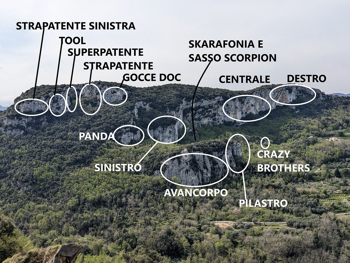 •Pilastro: il primo settore che si incontra arrivando dal parcheggio. Presenta sia vie storiche che linee più recenti; le prime hanno un’inaspettata distanza tra i fix, mentre le più nuove sono generosamente attrezzate, specialmente quelle più facili. È un settore vario, adatto a scalatori di diversi livelli.