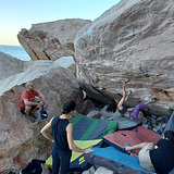 A rock fall above the coastline of Daskaleio gave birth of this little crag. The limestone blocks have good quality but may be a bit of dumb or salty when the wind is strong and waves big. Peacefull and quiet place most of the year with great view to the sea. Besides bouldering, there is also the option of sport climbing at the base of the cliff and dws at the left side of the coastline.