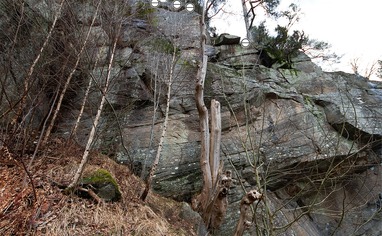 From the car park follow the road downhill and then turn left onto a gravelled road. Follow this road for a while and you will spot the crag between the trees on your right. The walk-in is about 300 m long.