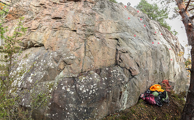 Drive road 261 from Brommaplan towards Drottningholm and follow the road for 4 km and turn right towards Hogsta riding sport (sign). Continue 2 km and turn right onto Lambaruddsvägen (towards Hogsta riding sport). Pass Hogsta riding sport and turn left after about 100 meters onto Norrbyvägen. Follow Norrbyvägen about 2 km to the parking lot by the Nature Reserve sign. Then walk to the right and follow the road along the houses. Then turn left and follow the wide path into the forest. Follow the marked path for approximately 700 meters and you will find the cliff right out towards the water.