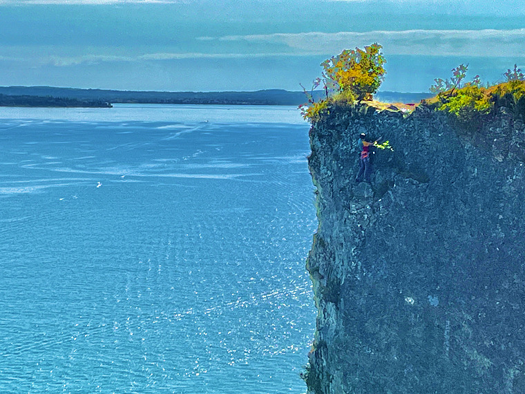 Questa non è la classica falesia con facile avvicinamento e base comoda per fare sicura. Manerba offre un’esperienza in stile Verdon, con vie accessibili tramite calate dall’alto della parete. Certo, paragonarla al Verdon può sembrare un po’ esagerato: la parete è alta solo circa 50 metri e la roccia è un’arenaria grigia compatta, ma l’esposizione sopra il lago regala un'esperienza davvero adrenalinica.