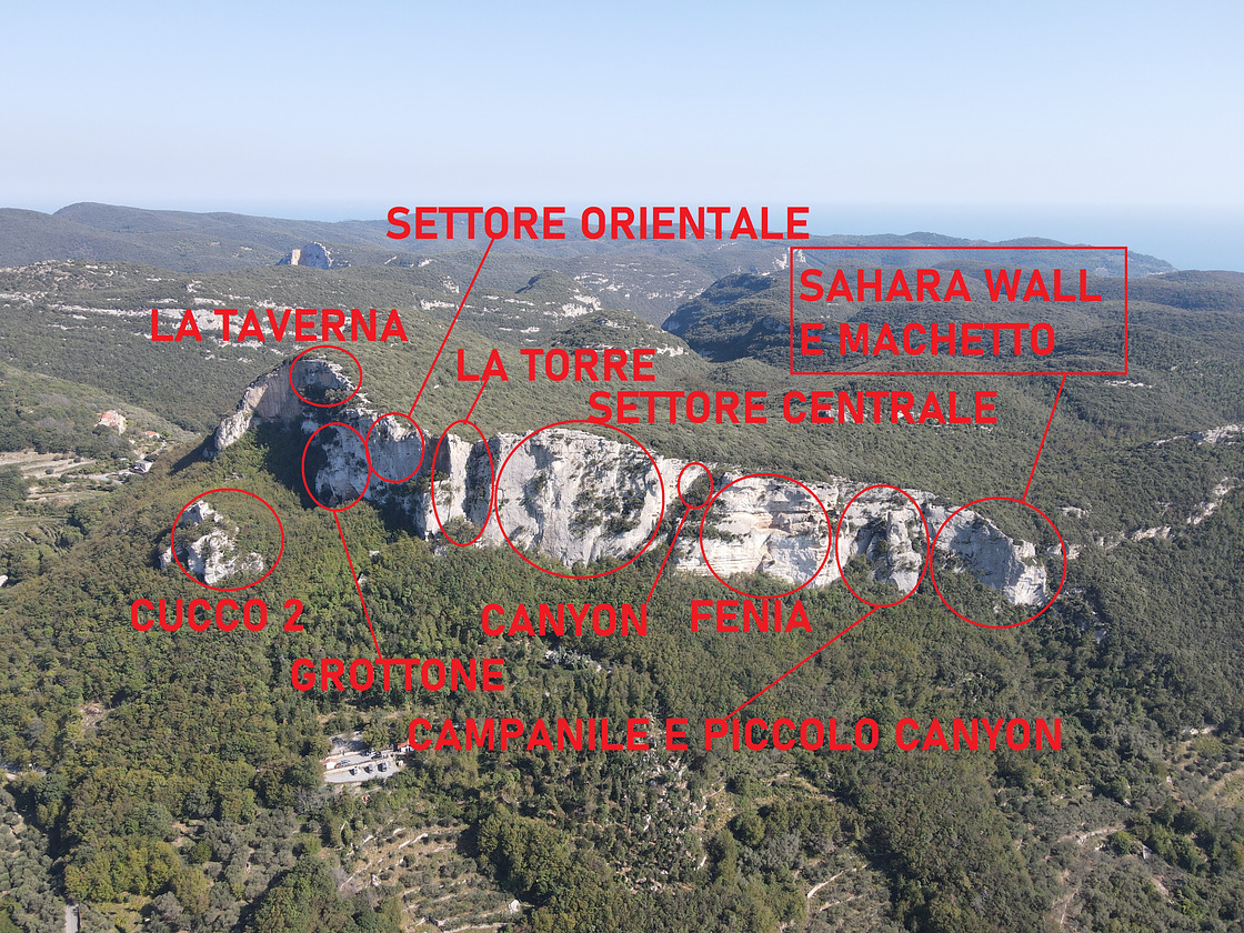 •W: Cucco 2, Settore Orientale, La Torre, Settore Centrale, Canyon, Fenia, Piccolo Canyon, Campanile, Sahara Wall, Machetto