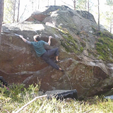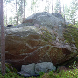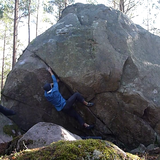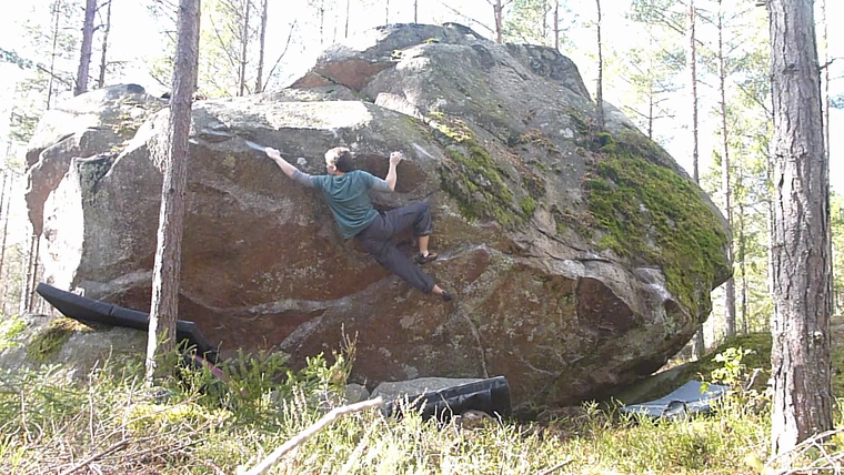 Single boulder with a some really nice problems located close to the road. The boulder is granite with lovely slopers and crimps. The two sides with harder problems "Inga mygg" and "Mange hittar nytt grepp" overhangs more than it looks on the topo images.