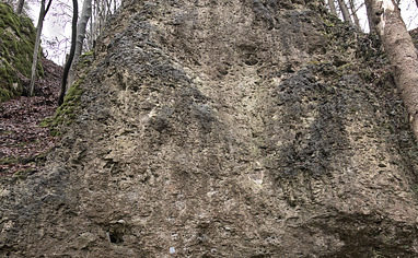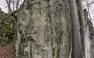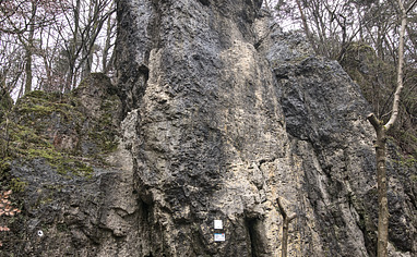 go straight ahead to the hiking trail leading up the hill into the forest (yellow sign). Almost at the top after about 150 m turn right and follow the trail passing boulders towards the crag.