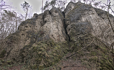 Keep following the trail north east along the edge of the forest until the trail leads into the forest. Soon there is another clearing to your right where a trail is leading right. Go ahead for some more meters until you'll end up at the crag to your right.